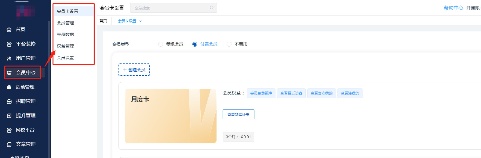 商家可通过数字平台管理后台-会员中心对会员体系进行管理;
